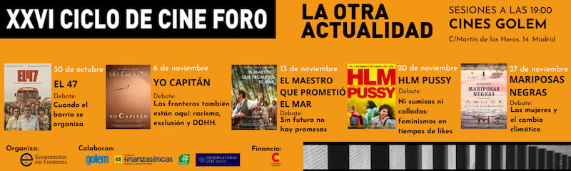 Todos los jueves, del 30 de octubre al 27 de noviembre, a las 19:00h, en los Cines Golem de Madrid, tendremos la oportunidad de disfrutar de una película y un debate en los que hablaremos sobre organización ciudadana, migraciones, educación, género y cambio climático, entre otros muchos temas.