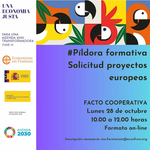 El lunes 28 de octubre continuamos con las formaciones centradas en el fortalecimiento de colectivos y empresas de Economía Social y Solidaria y del Tercer Sector. En esta ocasión conversaremos sobre proyectos europeos. Para ello, contaremos con @Facto Cooperativa, empresa catalana que ofrece servicios profesionales de gestión empresarial, formación y políticas públicas.