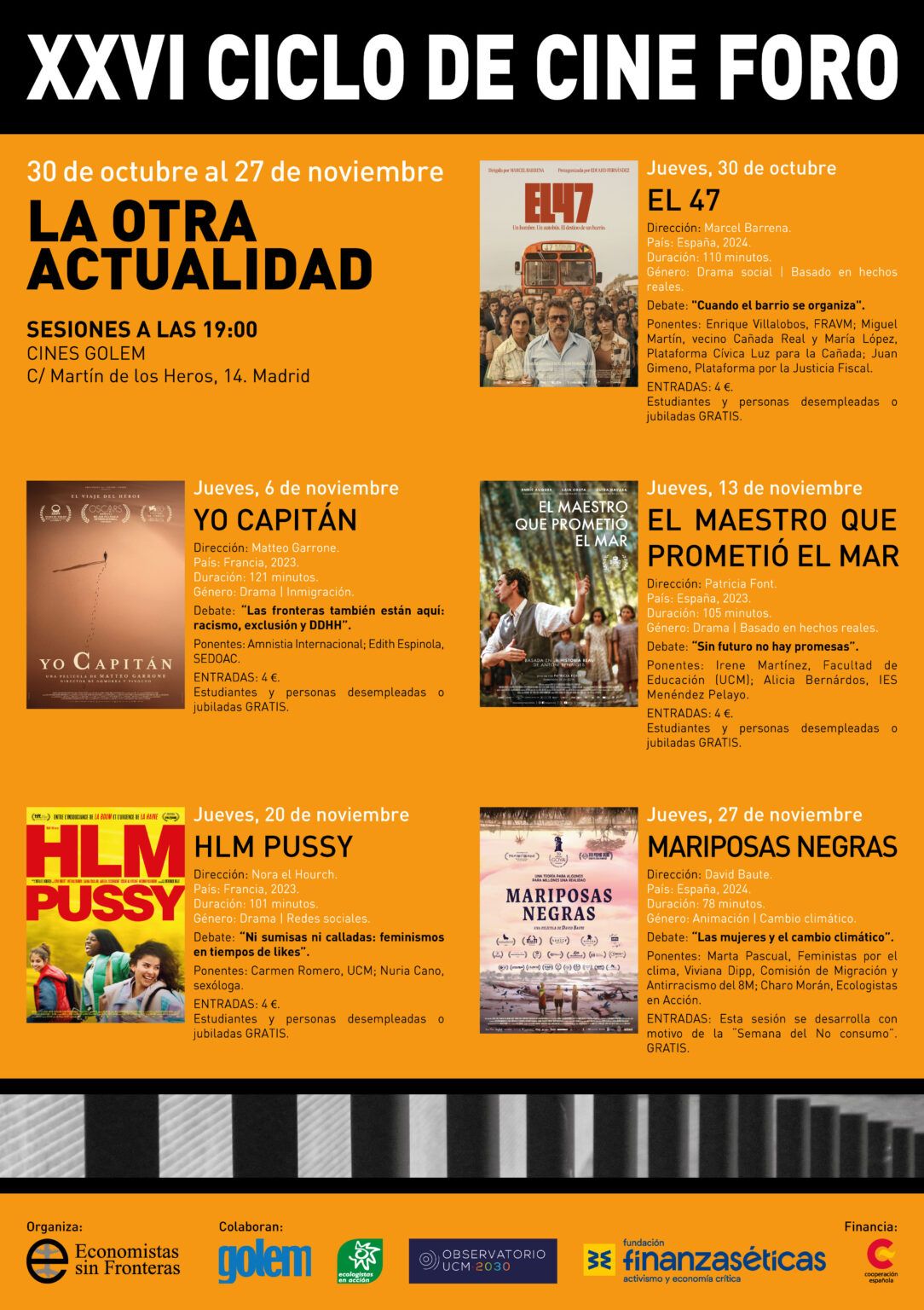 Los Cines Golem de Madrid volvieron a acoger, del 30 de octubre al 27 de noviembre de 2025, cinco sesiones que, conjugando el visionado de películas y el debate, mostraron otras realidades y nos hicieron reflexionar sobre otras temáticas.